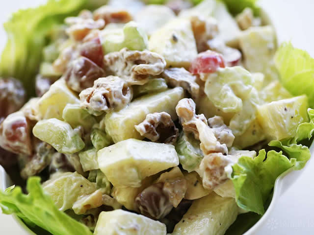Есть его потом не обязательно, помним про пункт 2. Порезать черешковый сельдерей, очищенное яблоко, виноград (да, да, каждую на 4 части). В примерно равных пропорциях ингредиенты разложить по тарелкам (ах да, попробовать его все же придется). Посыпать грецкими орехами. Заправить смесью майонеза и сливок. Главное, не переборщить.