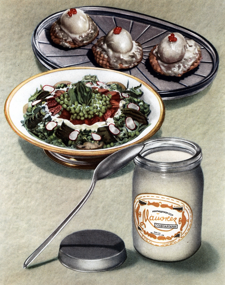 Второй по популярности салат — «Мимоза» — ухищрение эпохи дефицита. Выращенные на огороде картофель и морковь достаются из погребов и гаражей, отвариваются и трутся на терке. Туда же добавляется мелко порезанный лучок, тертые яйца. Рыбные консервы, если повезет, будут из лосося, если нет, то его заменит сайра или сардинка. Все это укладывается слоями, каждый из которых щедро смазывается майонезом. Даже в более поздние годы, когда дефицит сменился продуктовым изобилием, салат остался в числе любимых.