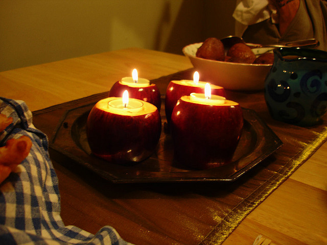 С елкой и входной дверью все понятно, теперь пора украсить интерьер. На праздничном столе как нельзя кстати придутся самодельные подсвечники: нужно в середине яблока или мандарина прорезать такое отверстие, чтобы туда вставлялась и держалась свеча, ее низ нужно украсить ленточкой, а на столе уже красуется «ароматический» подсвечник.
