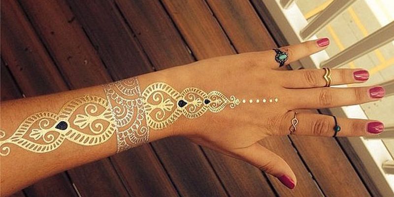 5. Гибрид украшения и татуировки — флеш-тату — изысканная новинка этого сезона. Временные золотые и серебряные наклейки, имитирующие кольца, браслеты, или просто рисующие на теле причудливые узоры. Они удивительно сочетаются с «настоящими украшениями», могут дополнить как довольно строгий, так и этнический стиль. Особенно хорошо flash-тату будут смотреться на загорелой коже под солнцем какого-нибудь южного пляжа. Менять их можно так часто, как заблагорассудится.
